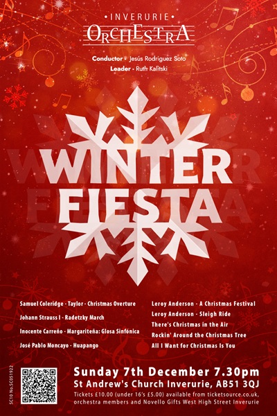 Tickets available from Novello Gifts, West High Street, Inverurie, from members or online at www.ticketsource.co.uk/inverurie-orchestra/winter-fiesta/2025-12-07/19:30/t-xdvoedmDescription: Winter Fiesta